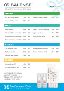 Balense is the range of high-performance skin care products that we use exclusively at The Cosmetic Clinic. They have been designed to help give you fast, visible results and promote healthy, fresh and radiant skin. Balense uses a simple four-step system of Cleanse, Boost, Hydrate and Protect.